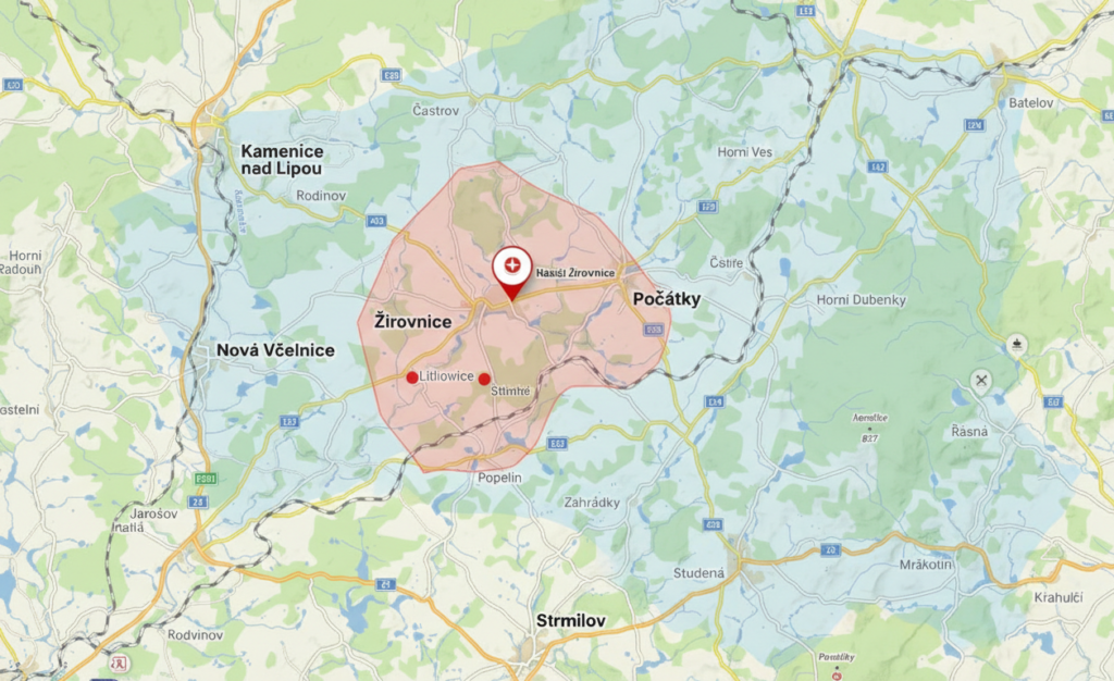 - Místní působnost (červené ohraničení): Primárně zabezpečují město Žirovnice a jeho místní části: Cholunná, Litkovice, Štítné, Stranná a Vlčetín.